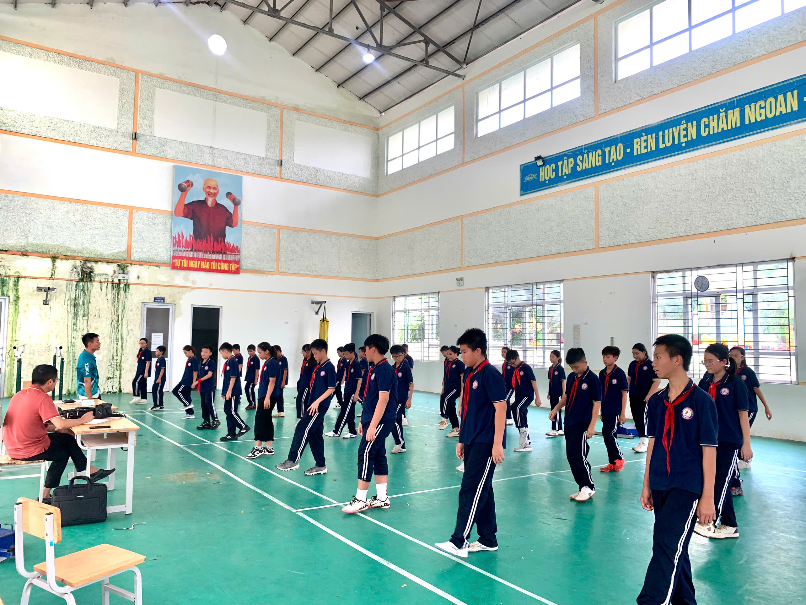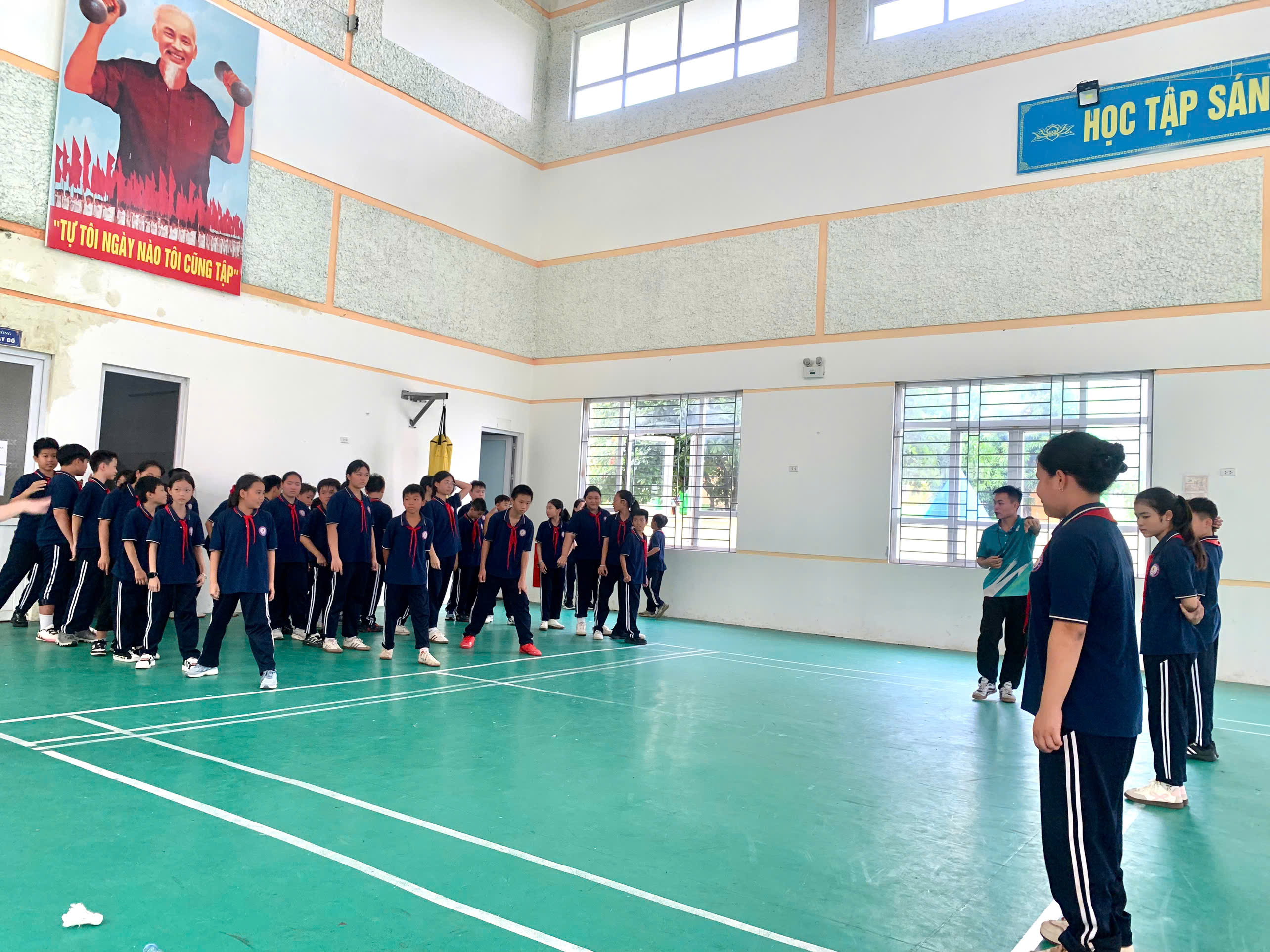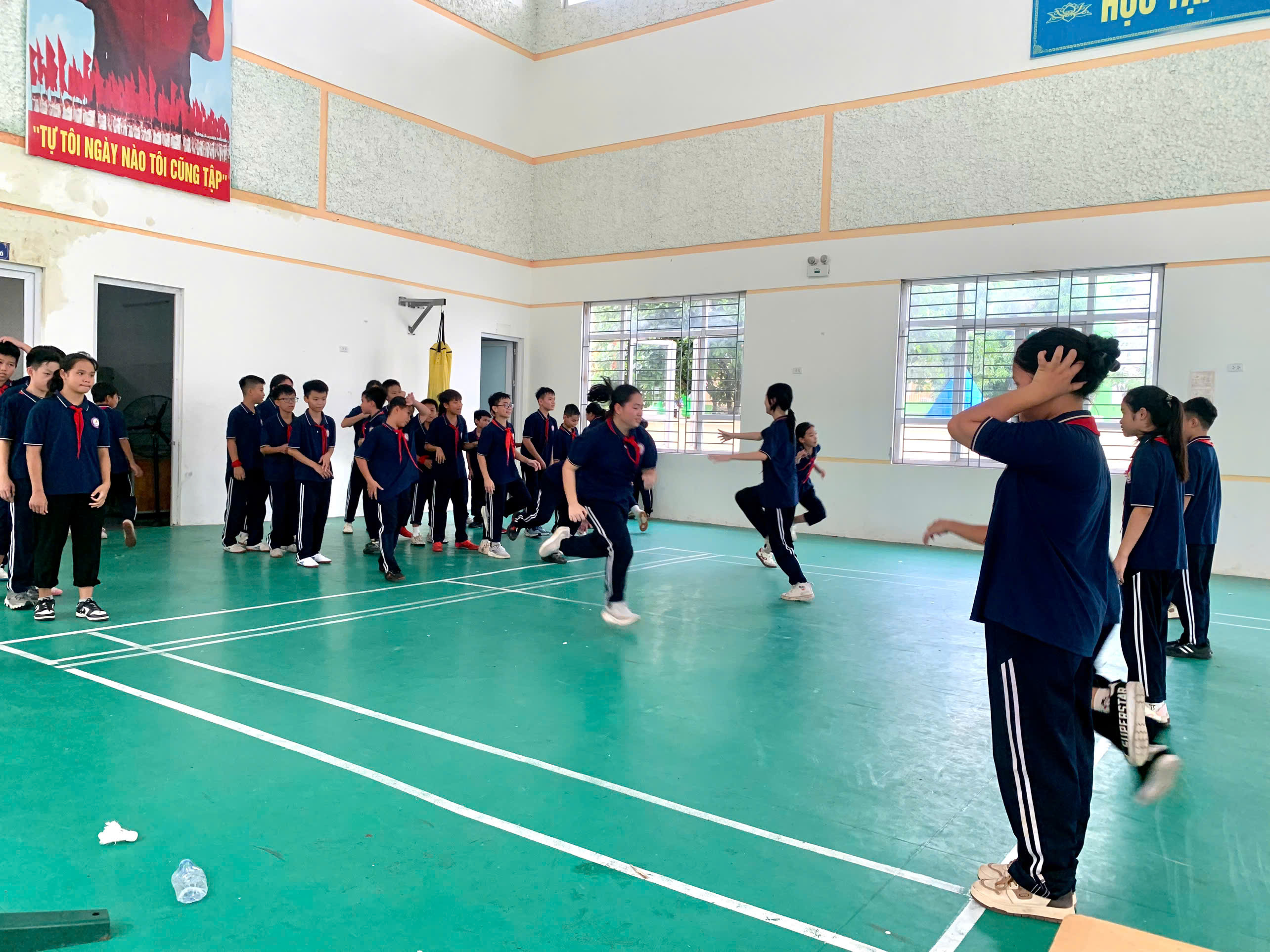 💪 Ôn luyện kỹ thuật giậm nhảy và bước bộ trên không dưới sự hướng dẫn tỉ mỉ của thầy giáo.