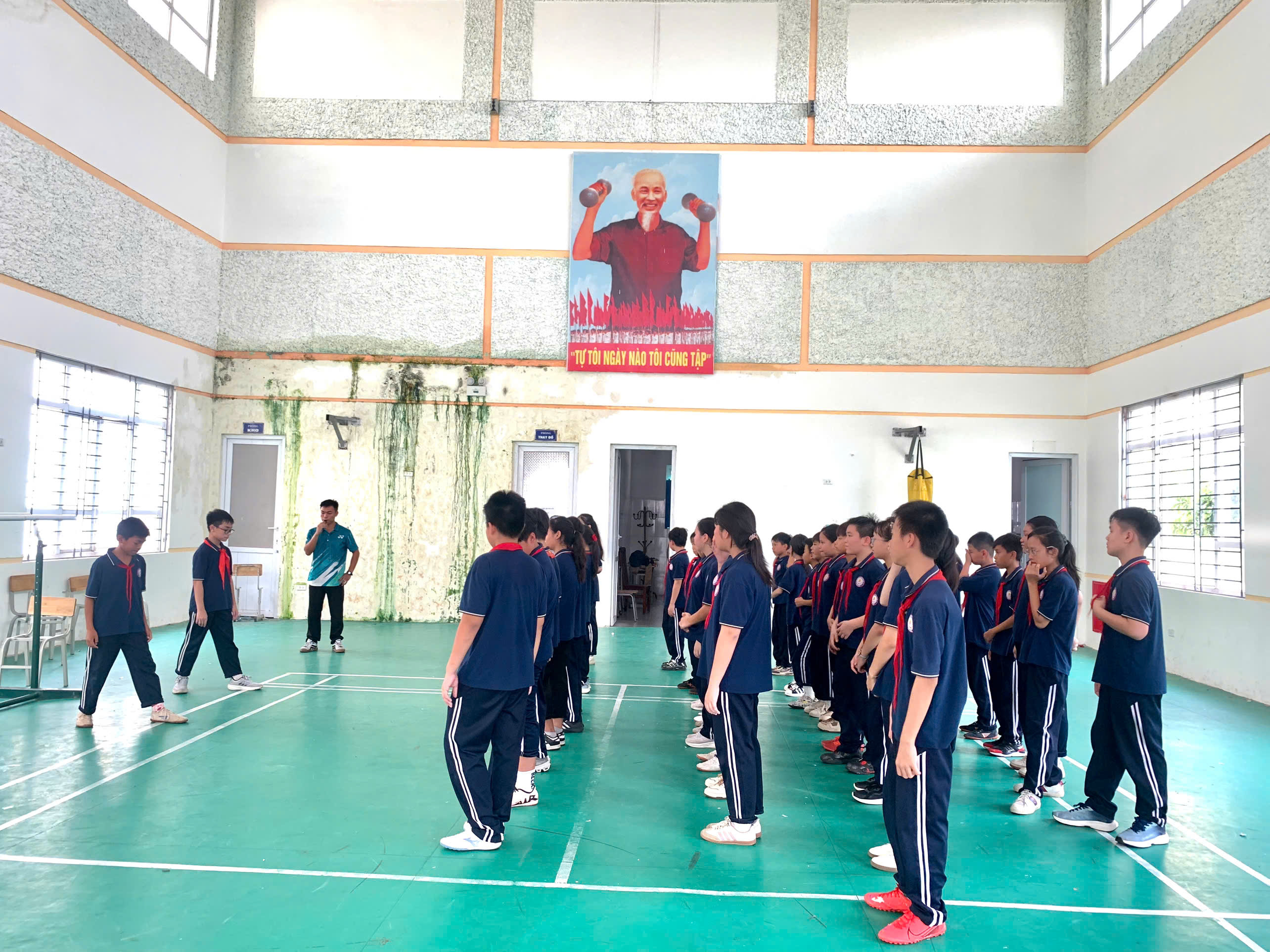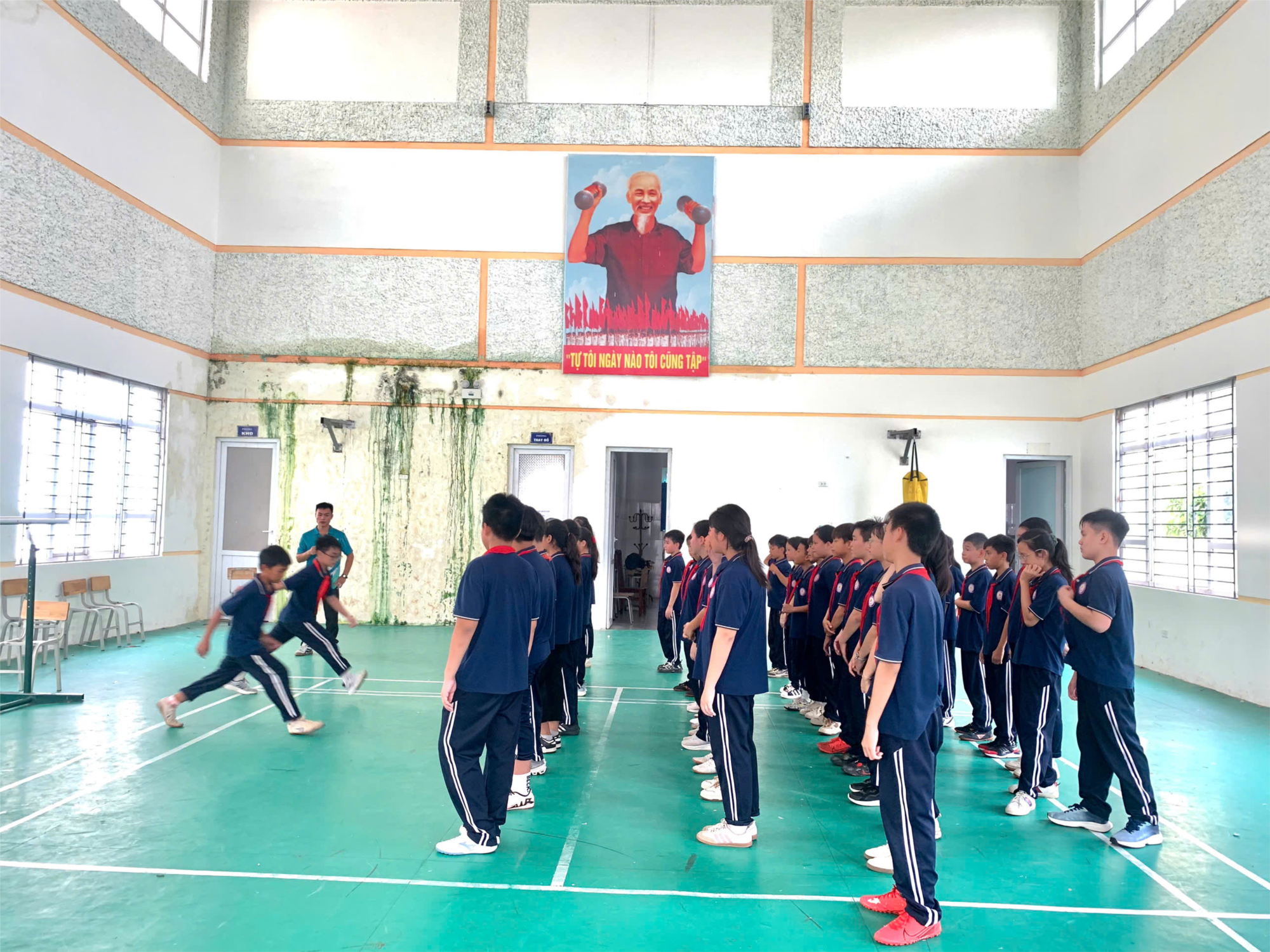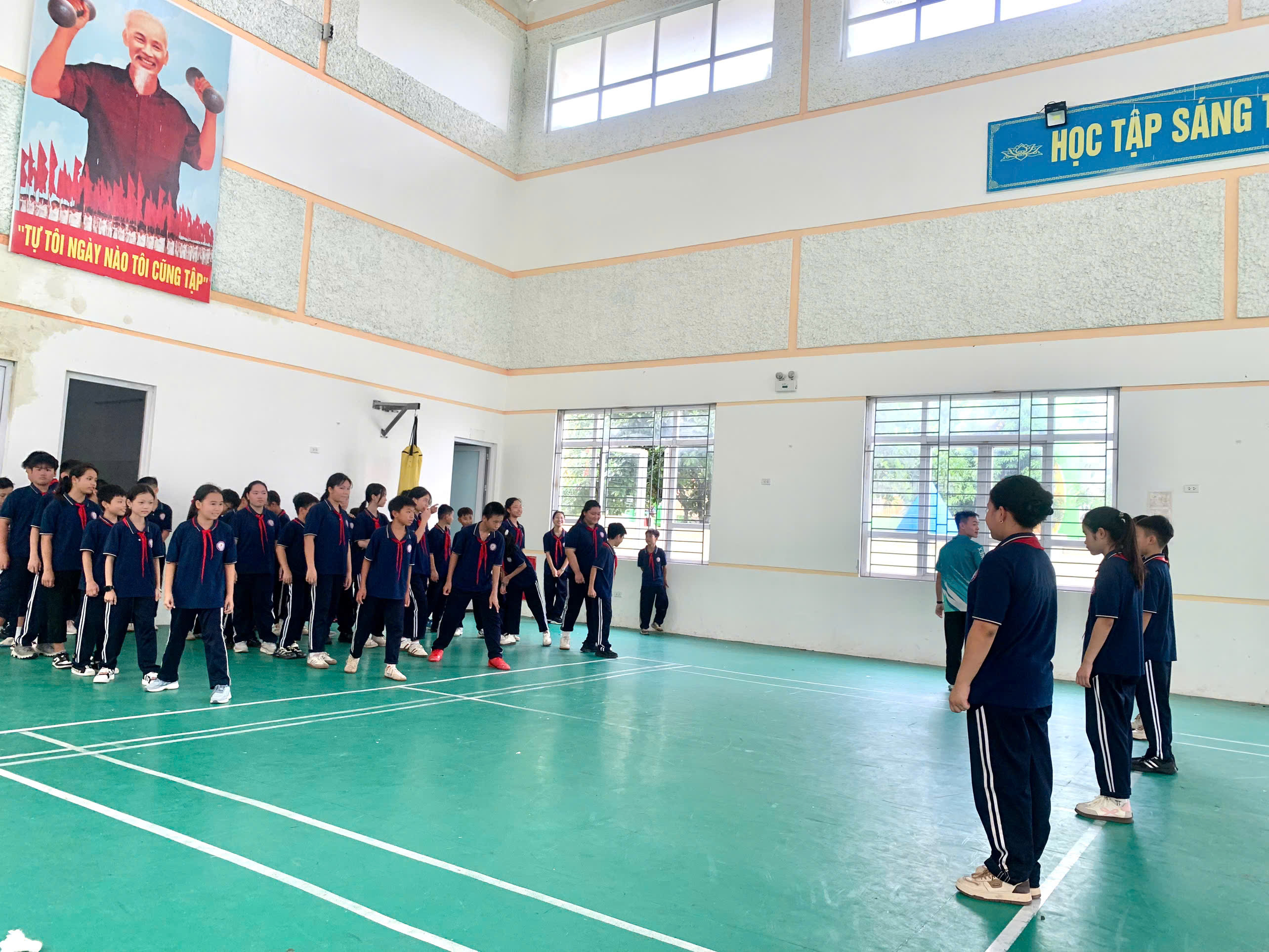 💪 Ôn luyện kỹ thuật giậm nhảy và bước bộ trên không dưới sự hướng dẫn tỉ mỉ của thầy giáo.