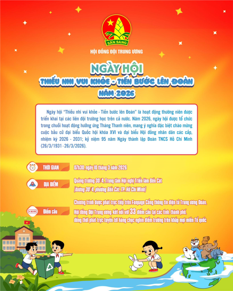 Ngày hội “Thiếu nhi vui khỏe - Tiến bước lên Đoàn” - hoạt động thường niên của các Liên đội trên cả nước - sẽ chính thức diễn ra trong chuỗi hoạt động hưởng ứng Tháng Thanh niên 2026, chào mừng 95 năm Ngày thành lập Đoàn TNCS Hồ Chí Minh (26/3/1931 - 26/3/2026) và hướng tới cuộc bầu cử đại biểu Quốc hội khóa XVI và đại biểu Hội đồng nhân dân các cấp, nhiệm kỳ 2026 - 2031.