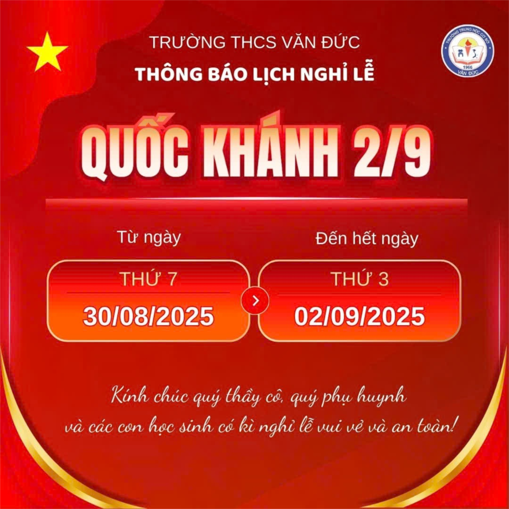 💌 Nhân dịp lễ lớn của dân tộc, trường THCS Văn Đức kính chúc Quý thầy cô, Quý phụ huynh và các con có kỳ nghỉ trọn vẹn, an toàn, nhiều niềm vui và ý nghĩa.