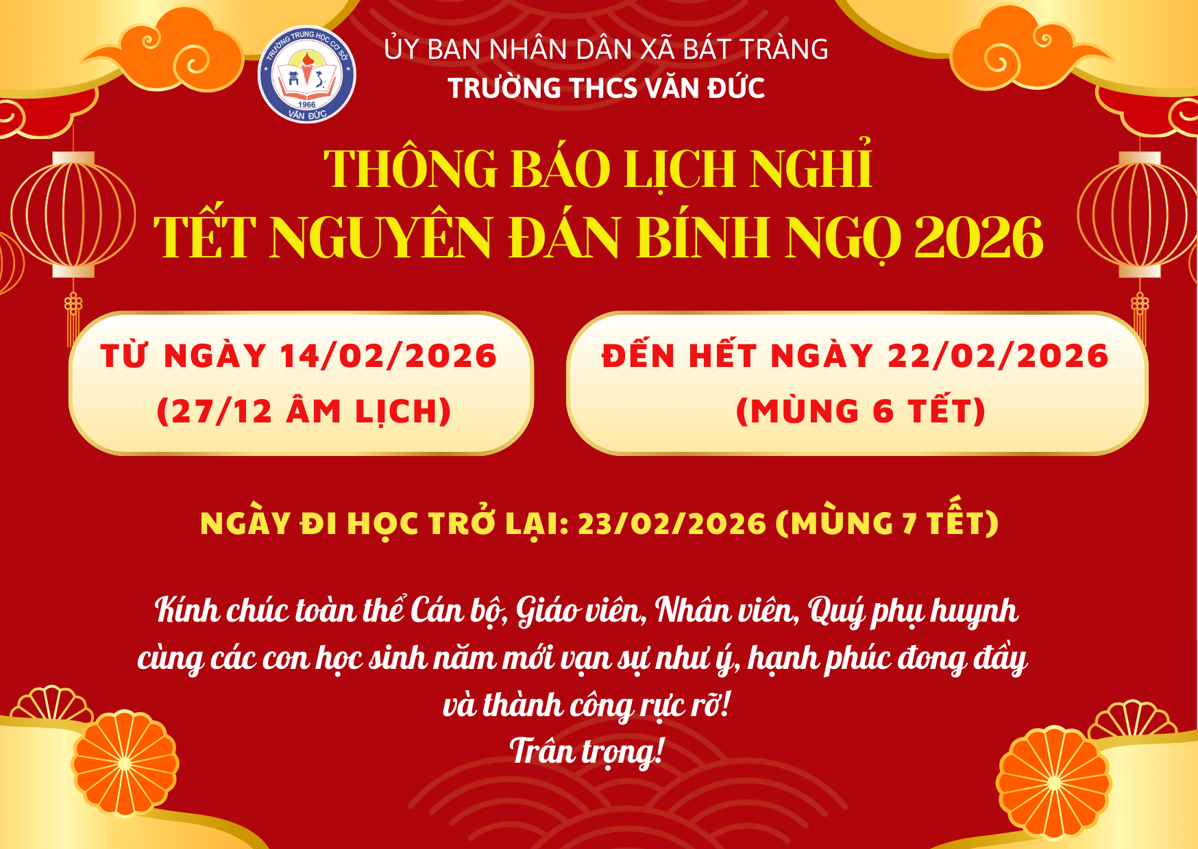 ✅Thời gian học sinh đi học trở lại: Ngày 23/02/2026 (Mùng 7 tháng Giêng).